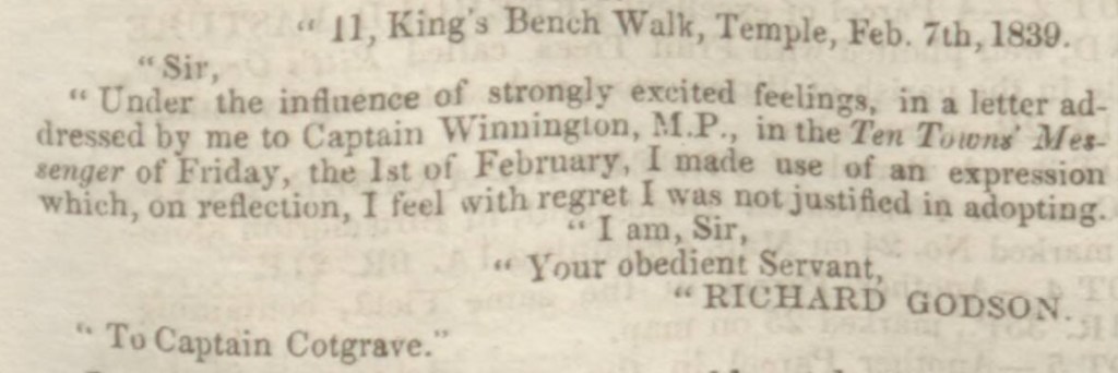 Godson knew he had been rash and in the nineteenth century, these kind of words might lead to a duel. Winnington appointed Edward Cotgrave as his second, but Godson was not ready to fight. Rather he needed to climb down with dignity. Cotgrave acted as intermediary and Godson wrote him a letter, with a kind of half apology. He admitted he was not justified in saying what he had, but excused himself as having been under the influence of “strongly excited feelings”.